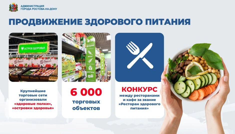 В России стартовало новое движение «За медицину здорового долголетия». Шесть центров здоровья в Ростове станут ключевыми партнерами в его реализации. Планируется разработать форматы для популяризации здорового питания с участием предприятий общественного питания, например, торговые сети уже организуют «здоровые полки».