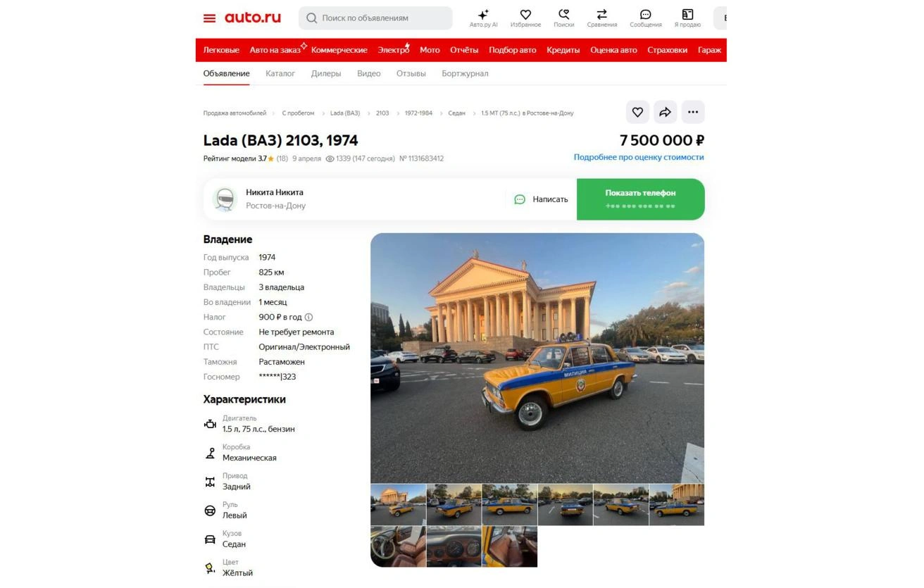 В Ростове выставили на продажу милицейский ВАЗ-2103 за 7,5 млн рублей