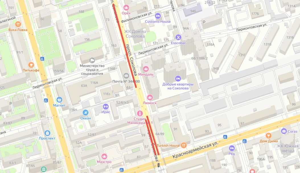 На пр. Соколова вдоль строений №64/89, и № 57 стоянку и остановку машин запретят в будние дни с 8:00 до 20:00, а круглосуточный запрет введут вдоль строений № 73 и № 63.