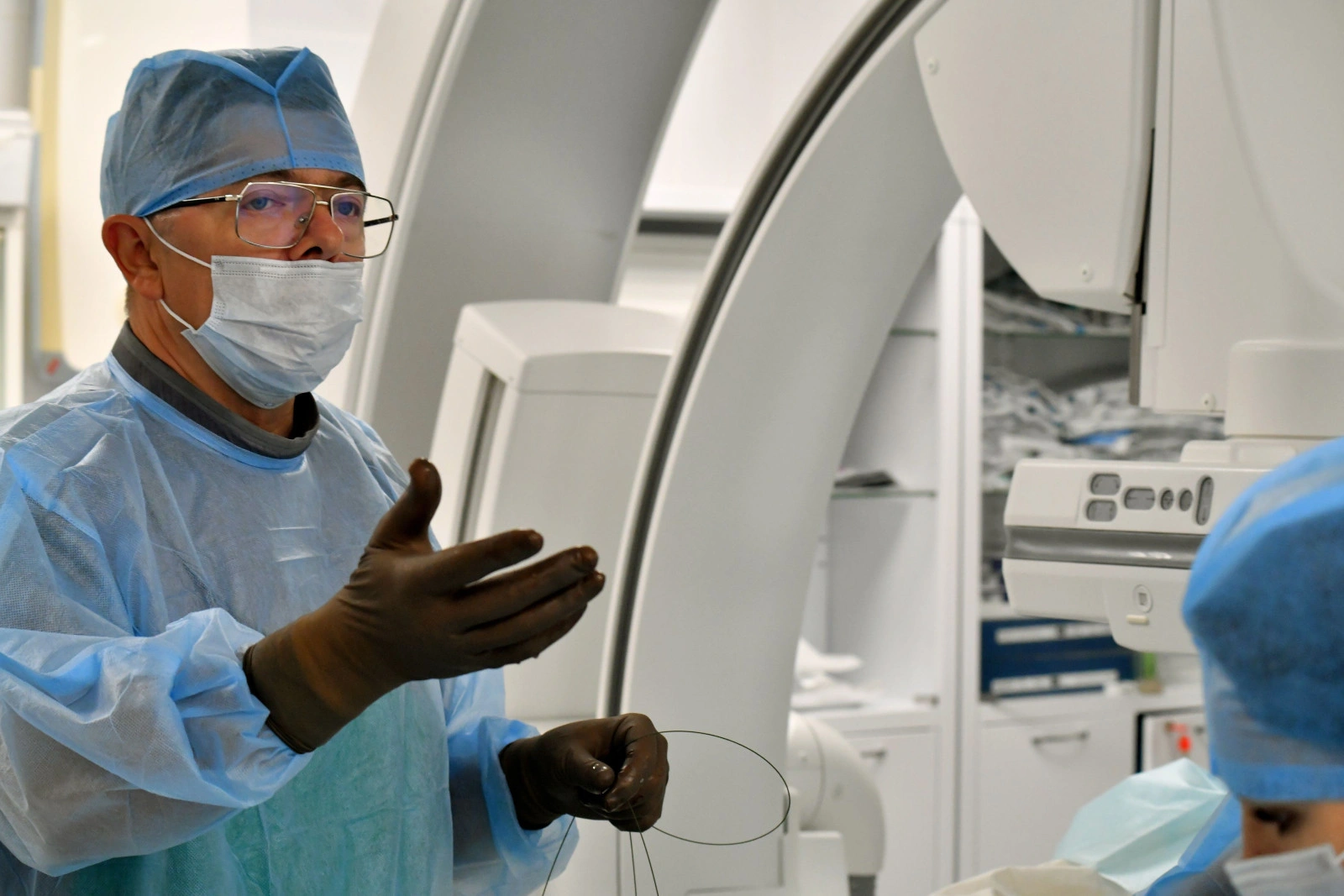Рентгенохирург через прокол в яремной вене вводит катетер в печень и с помощью металлического стента создает искусственный канал между венами, восстанавливая нормальное кровоток. Процедура сложная и длительная, с высокими рисками для жизни пациента. В РОКБ она проводится на современной ангиографической системе с дополнительными возможностями, включая компьютерную томографию во время операции.