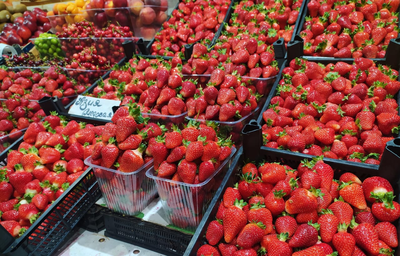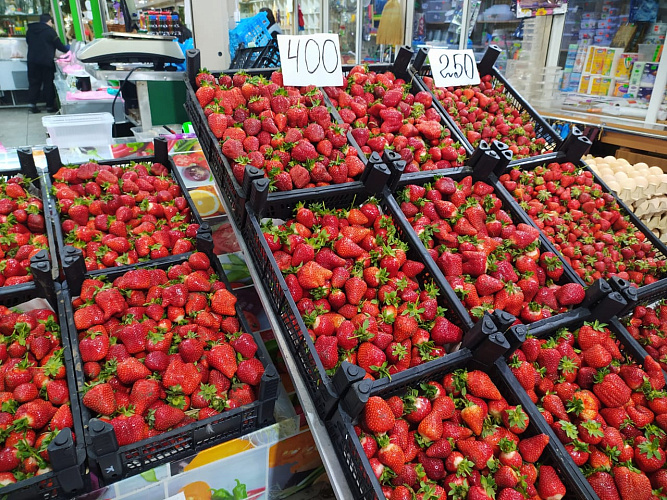 Несмотря на это, на том же Северном рынке всё усыпано клубникой. Не местной, конечно, но выбор тоже богат. Практически на каждом прилавке лежат ящики с крупной и ароматной ягодой.