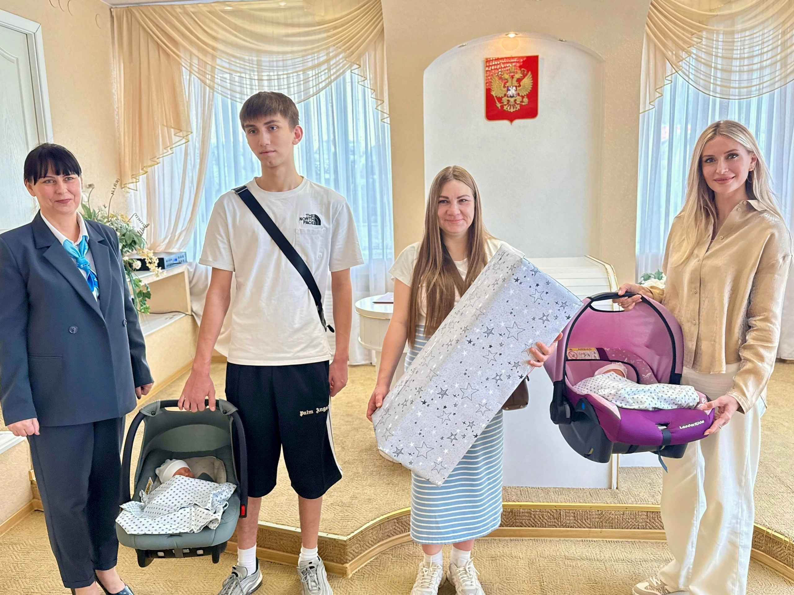 В торжественной обстановке молодой маме вручили свидетельства о рождении малышей Миши и Ксюши, а от местного отделения партии «Единая Россия» подарили нужный подарок — детский манеж.