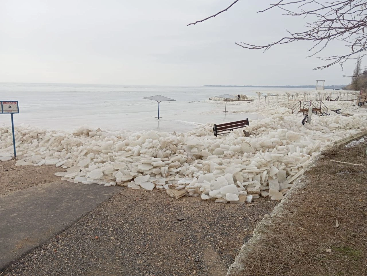 Из-за непогоды лед выдавило на берег, где большие глыбы повредили лавочки, урны и душевую кабину.