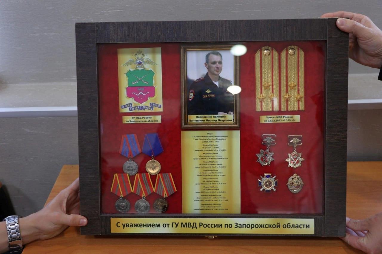 Начальник МВД Запорожской области Олег Колтунов лично передал награду вдове — медаль «За отличие в охране общественного порядка», присвоенную полковнику посмертно указом Президента за проявленное мужество. Леонид Панюшкин служил с 1997 года, прошёл карьерный путь от инспектора до начальника отдела миграции, неоднократно выполнял сложные задания в опасных условиях.