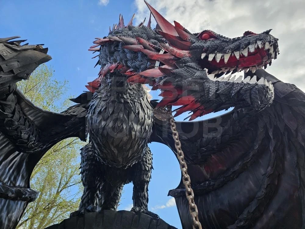 В основе фигуры — прочный металлический каркас, который мастер обтянул аккуратно вырезанными и закреплёнными кусками шин. Размах крыльев у дракона впечатляет — целых 4,5 метра.