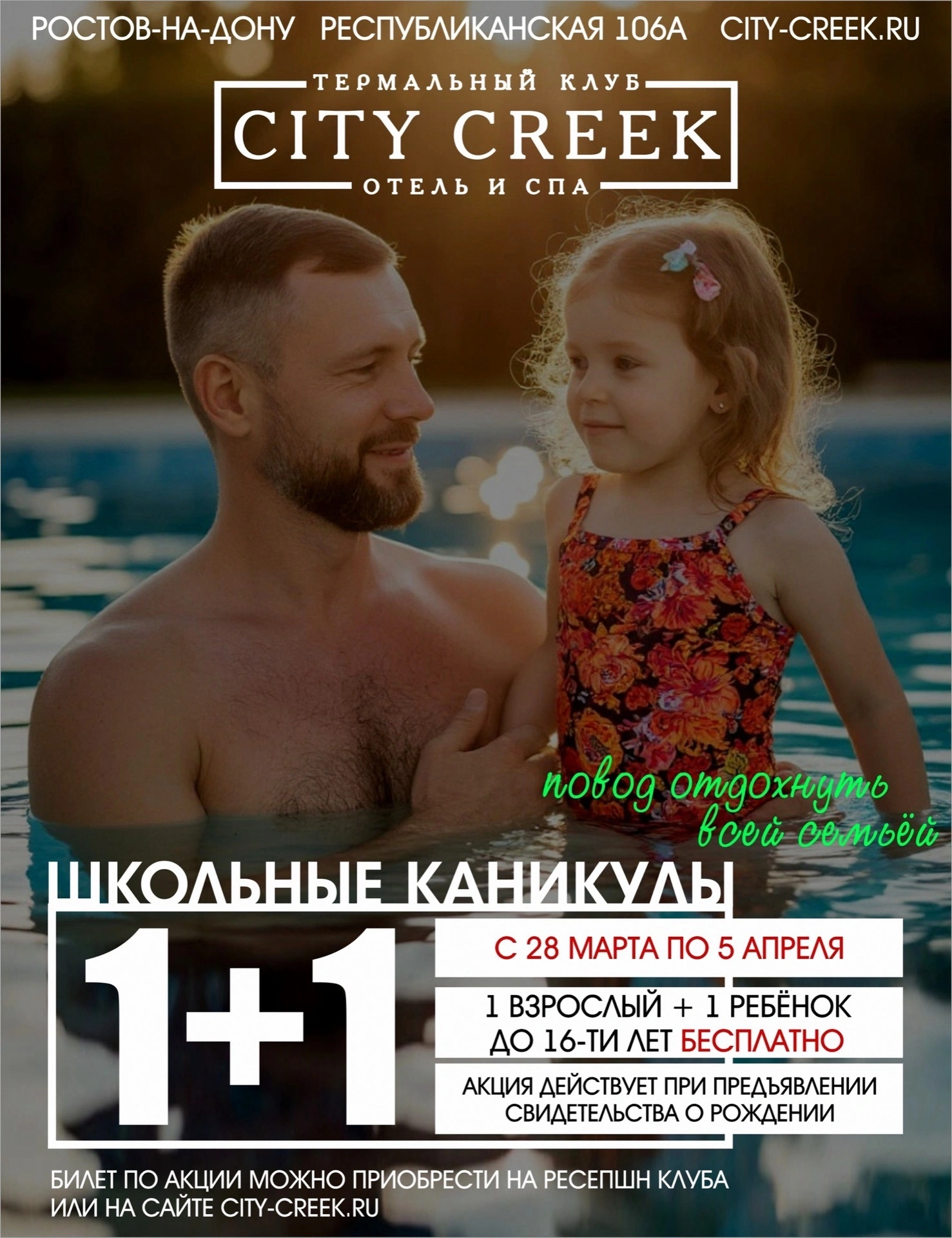Специальные билеты доступны на сайте city-creek.ru и на ресепшн нашего комплекса. Не упустите возможность, количество мест ограничено!