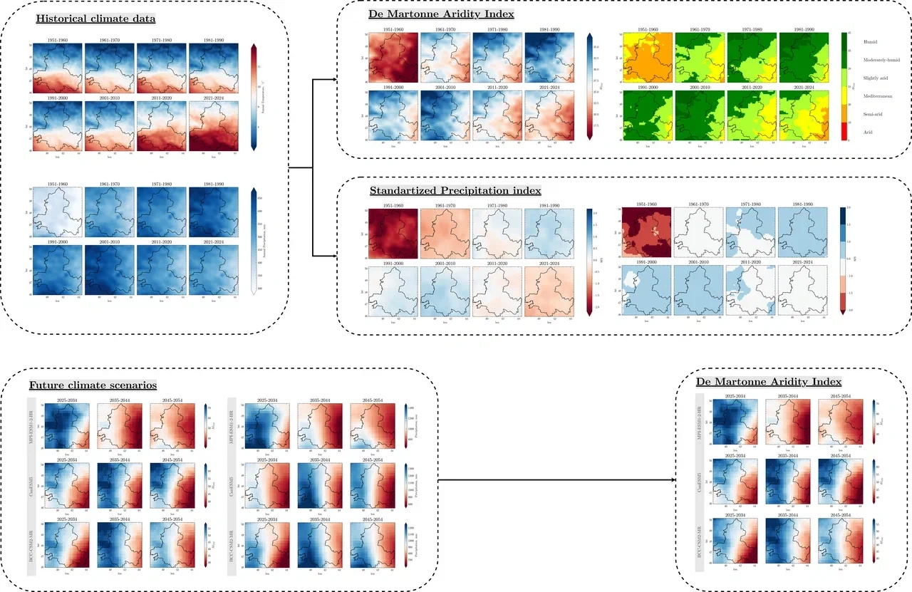 Глядя в будущее, можно заключить, что все три использованные климатические модели (MPI-ESM1-2-HR, CanESM5, BCC-CSM2-MR) предсказывают дальнейшее повышение температуры на 1,5–3°C к 2054 году. При этом сценарии изменения влажности различаются: некоторые модели предполагают стабилизацию условий, другие — усиление аридизации, что может привести к снижению индекса де Мартонна примерно на 15–25%.