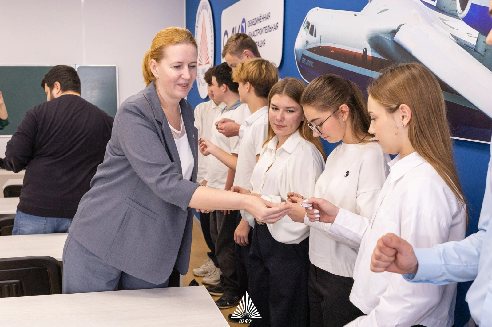 Ключевым моментом мероприятия стало посвящение учащихся в юные инженеры, в ходе которого представители ЮФУ и ТАНТК им. Г.М. Бериева (входит в ОАК) вручили школьникам памятные значки, символизирующие их новый статус.