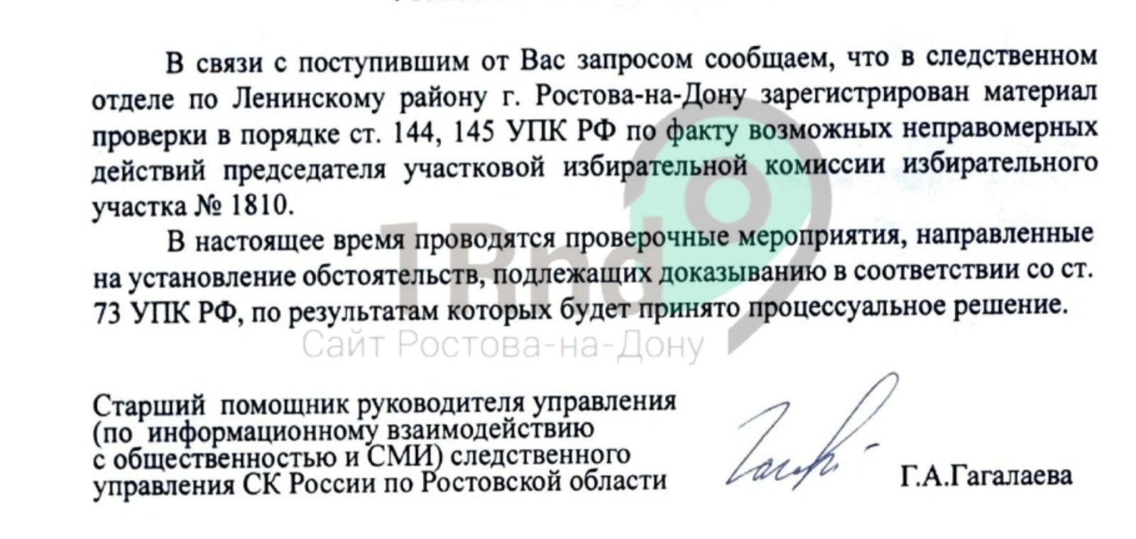 Законность действий председателя избирательного участка №1810 в Ростове проверит Следком