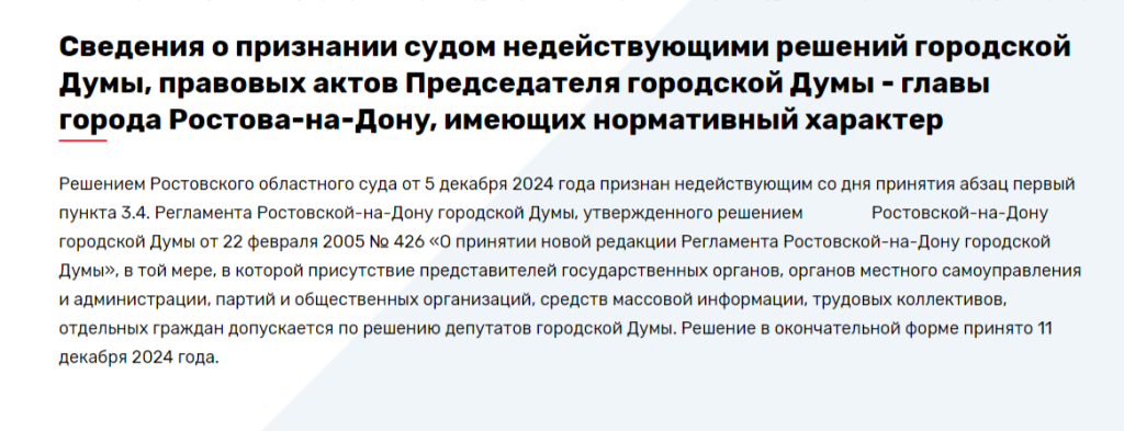 Такое решение вынес Ростовский областной суд. Он признал недействительным пункт регламента городской думы, который ограничивал участие сторонних лиц в законодательном процессе. Без предварительного согласия депутатов на заседания не допускали жителей города, представителей общественных организаций, госорганов и средств массовой информации. С 14 января такое разрешение больше не понадобится.