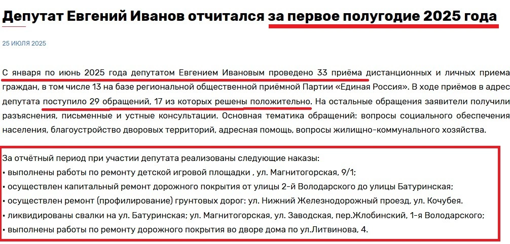 Что удивительно, решенные во втором полугодии 2024 года проблемы снова были решены в первом полугодии 2025 года. По крайней мере, так указано в официальном отчете на сайте администрации Ростова – та же детская площадка, те же дороги. Новых достижений в рамках решенных наказов избирателей в первом полугодии 2025 года у депутата не появилось.