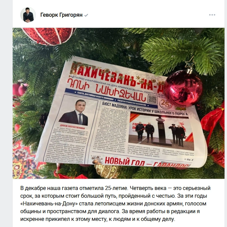 Соцсети Геворк Григорян ведет активно. Там и заседания думы, и встречи с избирателями с поступившими и решенными вопросами, и анонсы газеты «Нахичевань-на-Дону».