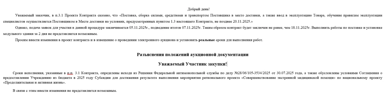 И все же в ноябре 2025 года БСМП удалось найти подрядчика. Исполнителем стал ООО «Медкон» из Красноярска. При начальной стоимости контракта 525 млн рублей, компания предложила выполнить условия за 467 млн рублей. Примечательно, что определились с подрядчиком 7 ноября. Согласно документам, поставить модульное здание исполнитель должен был до 20 ноября. Это было одной из претензий участников закупки. Согласно их заявлениям, контракт могли заключить только 18 ноября и поставить модульное здание за 2 дня просто невозможно. На что им отвечали: «Сроки исполнения, указанные в п.п. 3.1 Контракта, определены исходя из Решения Федеральной антимонопольной службы … а также обусловлены условиями Соглашения о предоставлении Учреждению из бюджета в 2025 году Субсидии для достижения результата выполнения мероприятия регионального проекта «Совершенствование экстренной медицинской помощи» по национальному проекту «Продолжительная и активная жизнь». В связи с этим внести изменения не представляется возможным».