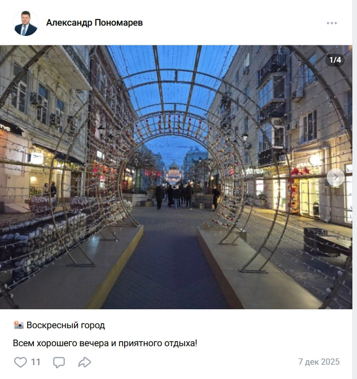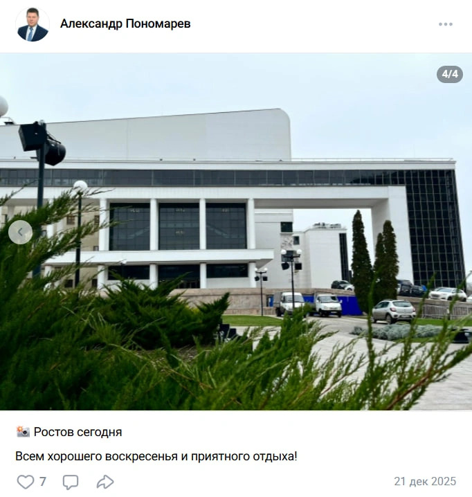 Также соцсети Александр Пономарев разбавляет фотографиями донской столицы с короткими подписями: «Ростов сегодня», «Морозный день в парке Горького», «Воскресный город».