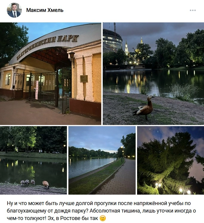 Соцсети Максим Хмель ведет с 7 апреля. Тогда он опубликовал первый пост о том, что собирается участвовать в выборах депутатов в гордуму Ростова. На своей странице он рассказывает о встречах с жителями Кировского района, партийных проектах, заседаниях, ветеранах. Часто в его публикациях затрагивается тема парков. Максим Хмель недоволен тем, что в Ростове мало зелени.