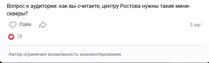 Максим Хмель в конце публикаций обращается к своим подписчикам с вопросами. Например, чего на взгляд ростовчан не хватает городским паркам? Однако оставлять комментарии на его странице запрещено.