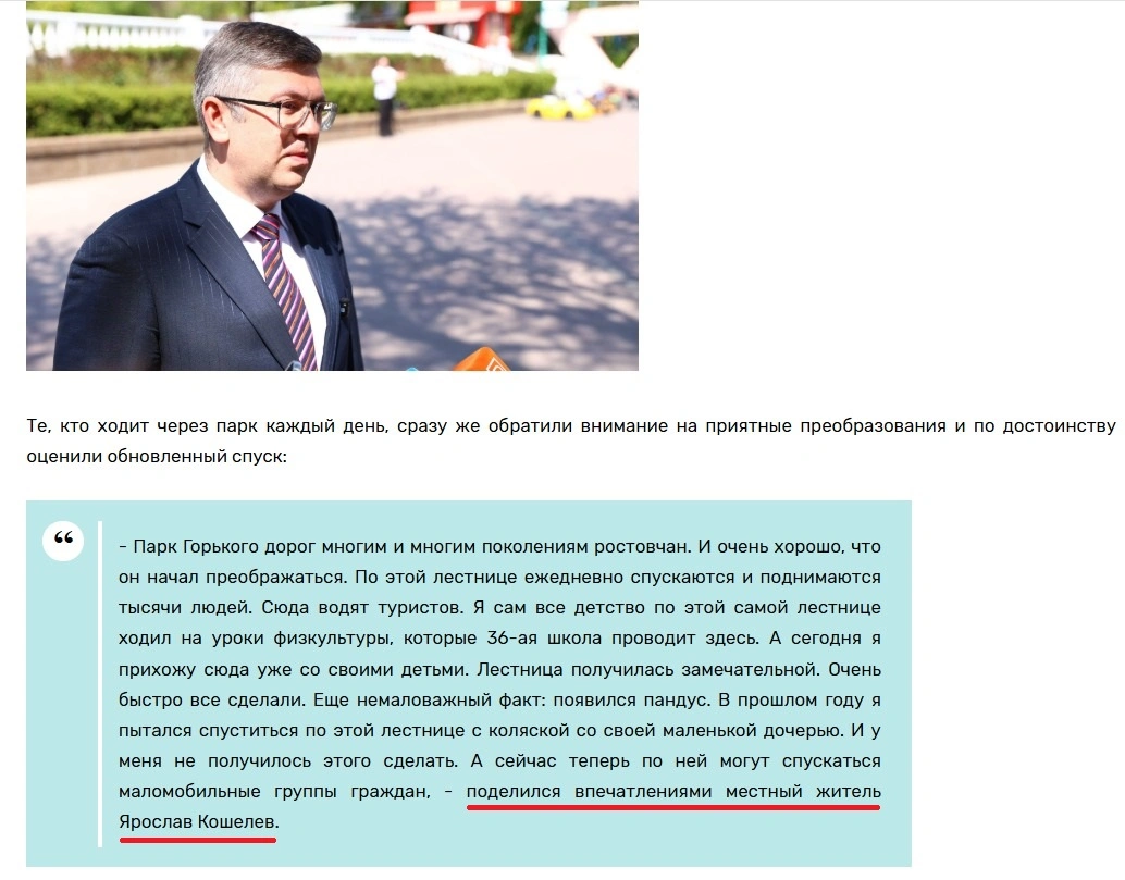 Есть упоминание о нем и на сайте администрации Ростова. В апреле 2025 года мэрия города рассказала об отремонтированной лестнице в парке Горького. В текст решили добавить комментарий случайного прохожего, который положительно высказался об изменениях. Им оказался Ярослав Кошелев, который уже тогда решил участвовать в предварительном голосовании «Единой России» и выборах депутатов гордумы Ростова. И видимо случайно в костюме встретился с журналистами в момент съемки сюжета о парке. При этом в администрации Ярослава Кошелева назвали просто «местным жителем».