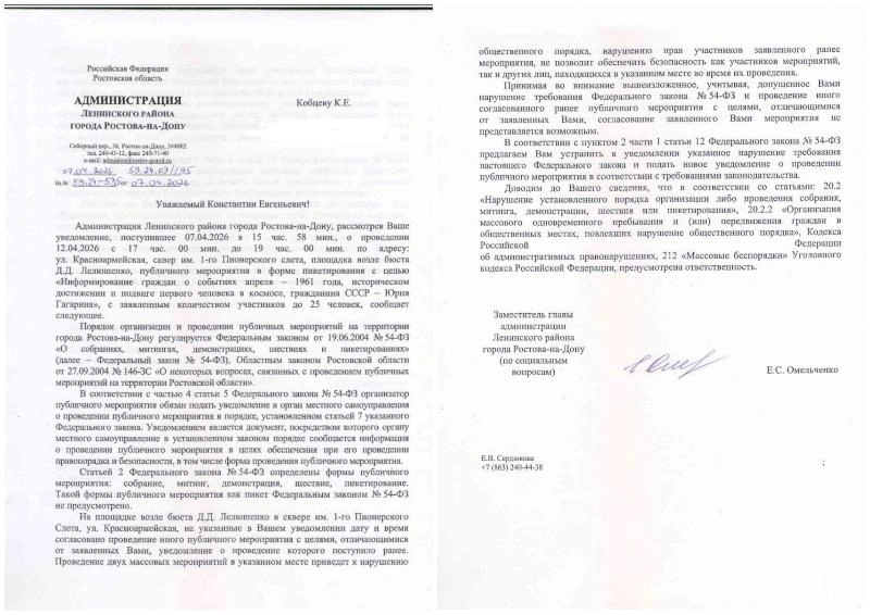 В конце 2025 года президент России подписал указ о ежегодном проведении в стране т. н. недели космоса. Сделано это, как следует из указа, «в целях популяризации достижений отечественной космонавтики и повышения престижа профессий, связанных с космической деятельностью». Но власти Ростова об этом, видимо, не предупредили. Они отказали в проведении пикета, целью которого было ознакомление жителей с событиями апреля 1961 года, когда был совершен первый полет человека в космос.