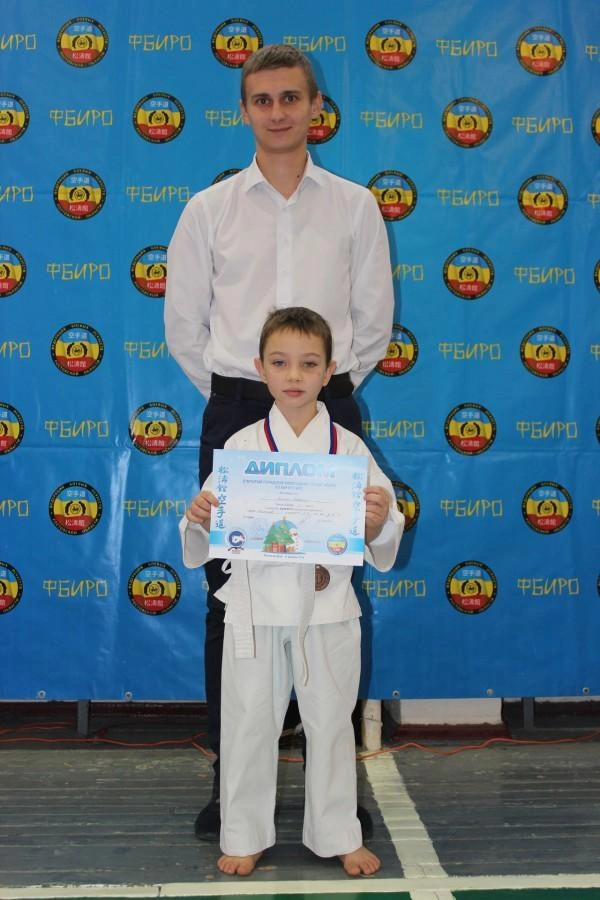 Максим занимается в клубе Каратэ Восток с 2014 года. Тренер Андрей Сергеевич Верведа. На фото первые в жизни городские соревнования и первая победа. Фото называется вкус победы))